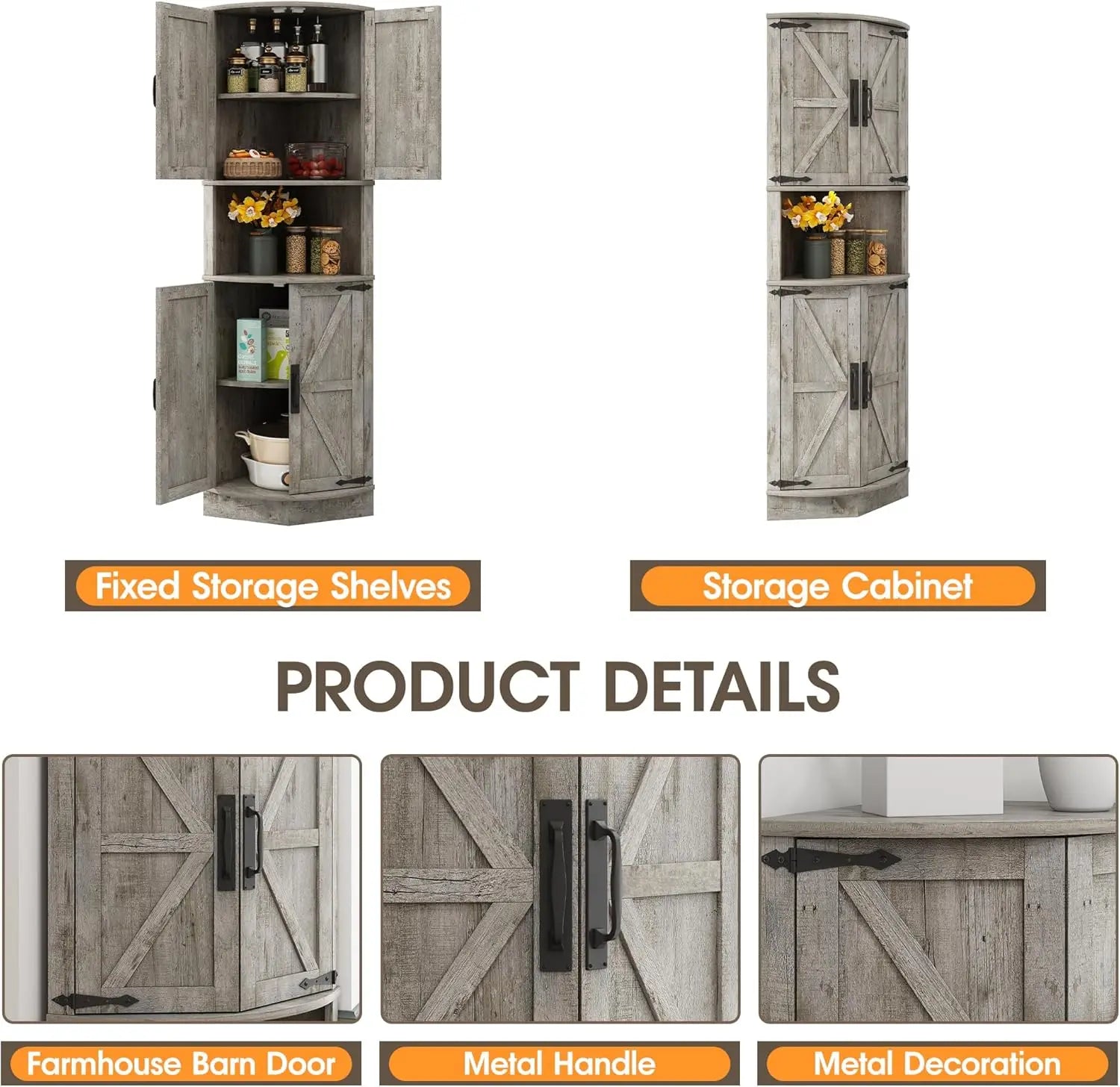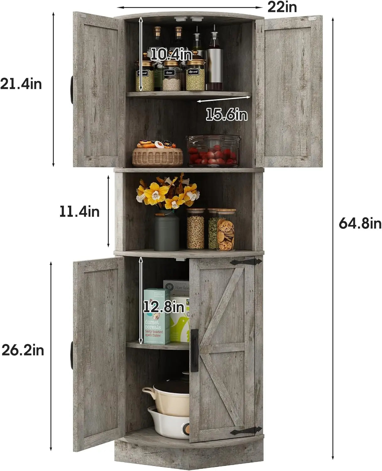 - [Storage Space Tailored To Your Needs] Dimensions: 22''(W) x 15.6''(D) x 64.8''(H).The corner cabinet has storage shelf at the top and bottom. With its streamlined silhouette and natural tones, it saves space while adding a charming rustic feel, making it the ideal classic farmhouse piece for the corner of your home.